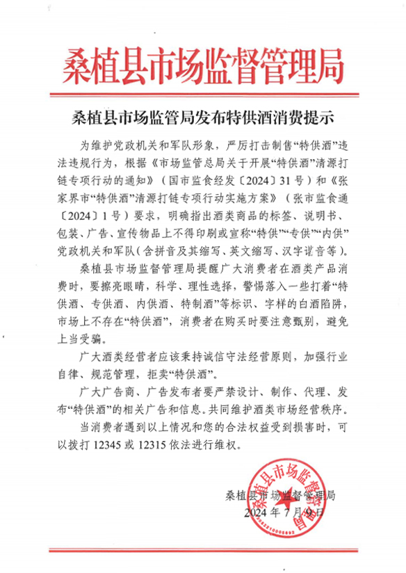 桑植县市场监督管理局提醒广大消费者在酒类产品消费时,要擦亮眼睛,科学、理性选择,警惕落入一些打着“特供酒、专供酒、内供酒、特制酒”等标识、字样的白酒陷阱,市场上不存在“特供酒”,消费者在购买时要注意甄别,避免上当受骗。