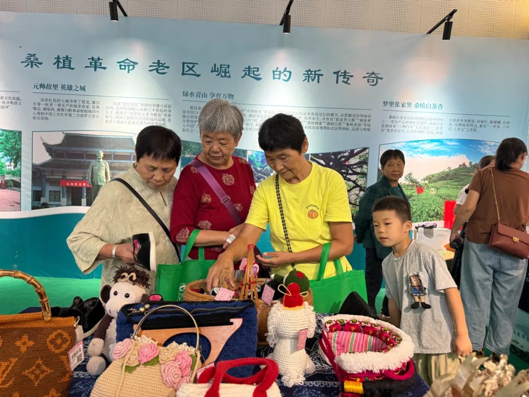 在桑植旅游商品展馆前,身着土家族和白族服饰的工作人员向过往市民和游客推荐桑植农特产品,并热情邀请大家免费品尝特色腊肉和特色小吃。展台上,桑植白茶、桑植茶油、桑植蜂蜜、桑植魔芋、羊肚菌、葛根粉、霉茶、大鲵零食等商品琳琅满目,独具民族特色的土家织锦、手工布鞋、手工编织包等吸引大家纷纷驻足。