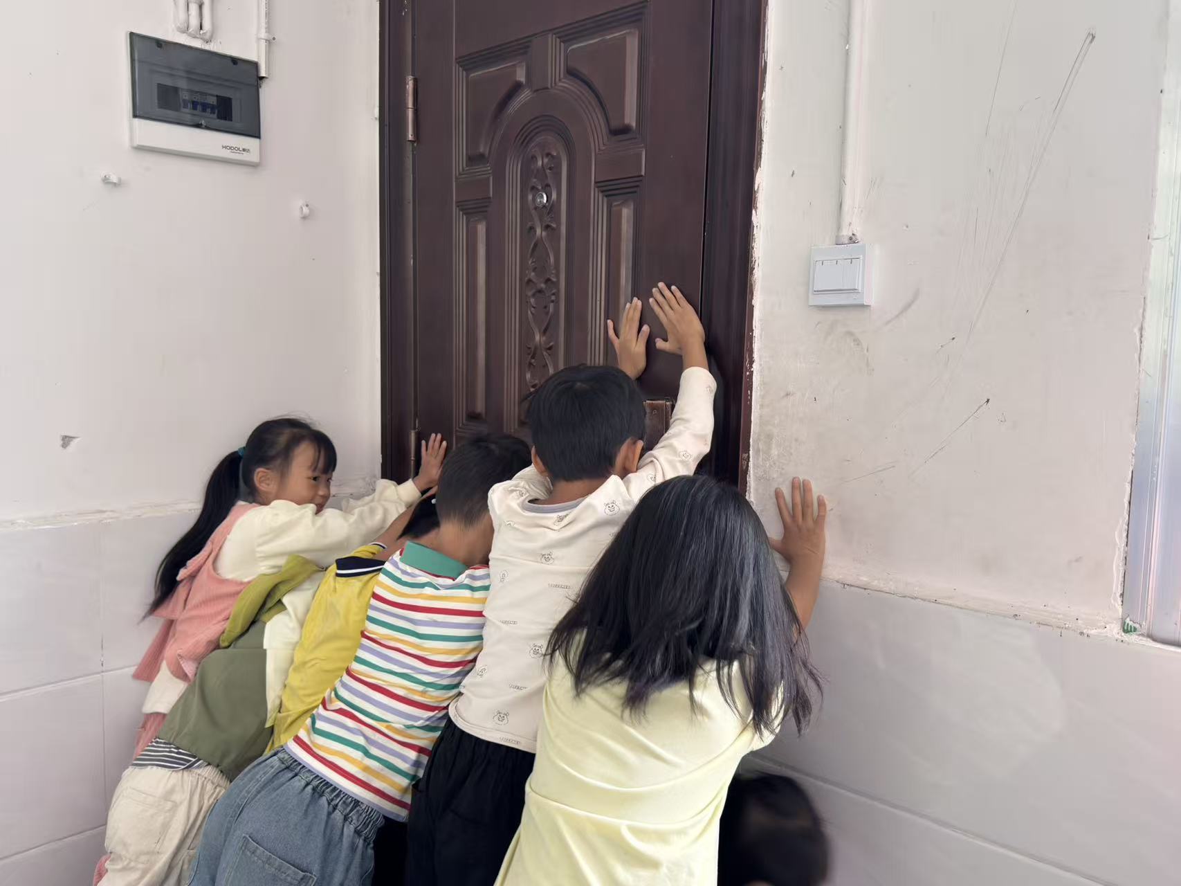 演练模拟“暴徒”的两名老师手持凶器试图强行闯入校园,校门口安保及老师们发现后,立即利用防暴盾牌阻拦“暴徒”,为师生避险争取时间。同时,该校相关负责人吹响哨声,正在操场上玩耍的学生们第一时间跑到二楼教室,教师们锁住二楼大门,并组织学生关闭教室门窗,保持安静,避免吸引“暴徒”注意。面对“暴徒”的冲撞,安保人员和教师们分工协作,最终合力将其按倒在地,成功“制服”。整个处置过程动作快、准,配合默契。