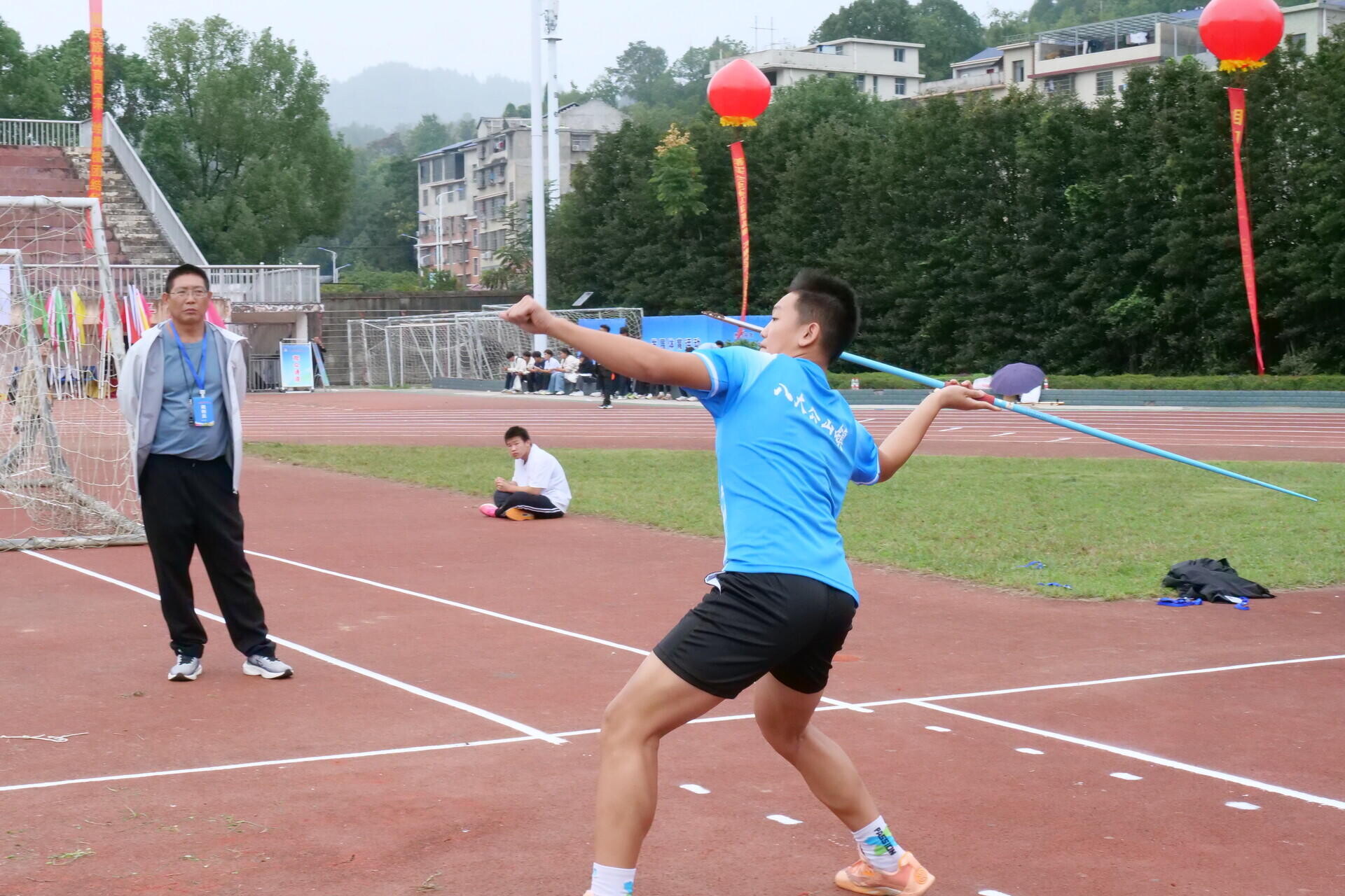 同一片田径场上,男子乡镇丙组标枪决赛同样扣人心弦。选手们依次助跑、加速,奋力一掷,标枪在空中划出道道优美弧线。桥自弯镇的李佳烛大步流星,完成漂亮的交叉步后全力投掷,标枪以完美的抛物线飞向远方,最终以42.26米的成绩夺得冠军。