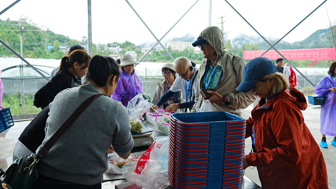 在硕果累累的葡萄园里,新加坡游客们手持果篮,兴致勃勃地体验采摘乐趣。一串串晶莹剔透的阳光玫瑰葡萄在雨水下闪耀着翡翠般的光泽,游客们一边品尝着甘甜多汁的葡萄,一边用手机记录下这难忘的田园时光。“桑植的山水和田园风光让人难忘,今天我们每人都买了不少葡萄,有机会一定要带家人再来。”游客欣喜地分享道。