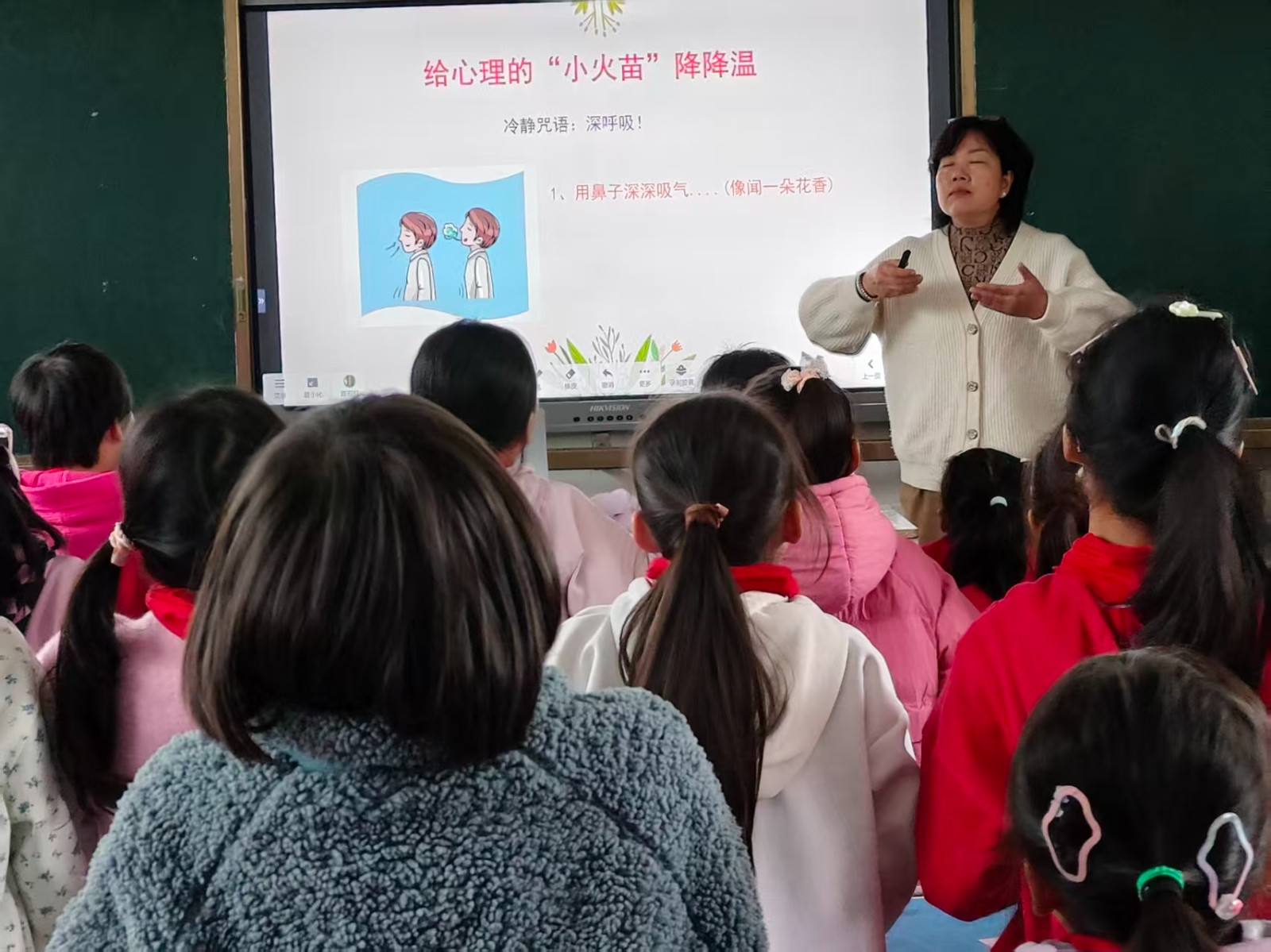 讲座以互动问答开场,老师通过“考试失利、朋友矛盾”等生活化问题激发学生共鸣,引导学生正确认识各种情绪,并传授“情绪管理小魔法”,现场带领学生练习“闻花香”吸气、“吹蜡烛”呼气,让大家在体验中掌握情绪“降温”技巧。“以前难过时总不知道该怎么办,这次讲座教会我用深呼吸调节情绪,还知道遇到困难可以找老师和同学帮忙,感觉心里踏实多了,以后会试着当情绪的小主人!”该校五年级学生刘佳怡说道。