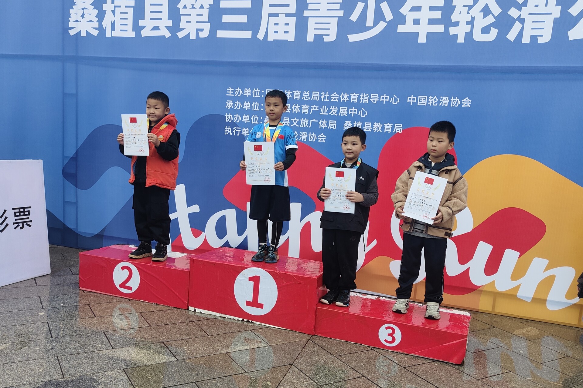 比赛的焦点是男子U8组100米速度轮滑决赛。发令声响,选手李俊霖率先冲出,在前半程确立了明显优势。然而,进入最后弯道时,紧随其后的小将谭宗玺抓住时机,利用一个极其狭窄的内道空隙果断实施超越,两人几乎并肩滑入直道。最终,谭宗玺夺得冠军。“今天下雨了,赛道很滑,但是我努力地滑,最后拿到了三个奖牌,非常开心!”谭宗玺说道。