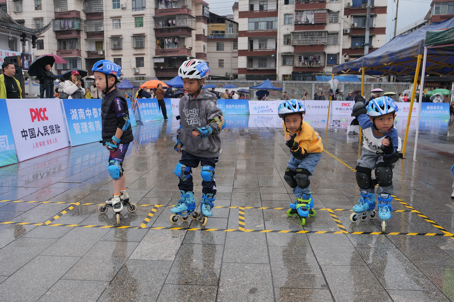赛场同样不乏温暖与坚韧。在女子U6组100米比赛中,由于赛道湿滑,一名身着绿色队服的小选手在冲刺线前因重心不稳摔倒,但她没有丝毫犹豫,立刻撑地爬起滑过了终点。观众给予了小选手鼓励和掌声,共同铸就了比金牌更动人的瞬间。