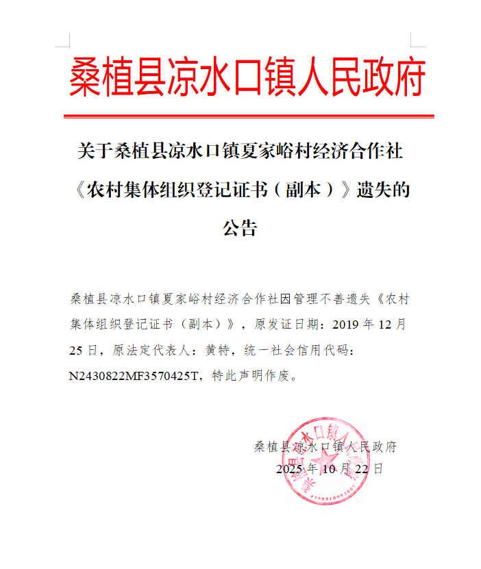 桑植县凉水口镇夏家峪村经济合作社因管理不善遗失《农村集体组织登记证书(副本)》,原发证日期:2019年12月25日,原法定代表人:黄特,统一社会信用代码:N2430822MF3570425T,特此声明作废。