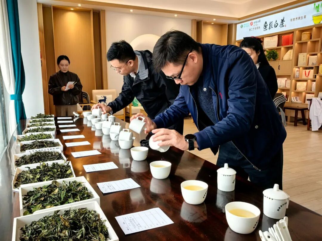 比赛在湖南湘丰桑植白茶有限公司举行,参赛茶样均为2025年桑植白茶“花系列”产品,邀请了湖南省茶叶研究所博士余鹏辉、黄浩担任评委,从专业角度对茶样进行系统评定。比赛现场设有茶样接收区、审评区和等候区,整个流程采用“密码审评”方式。