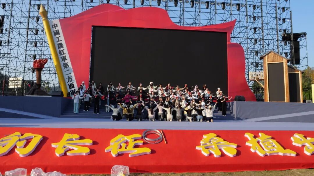 在干田坝搭建的舞台上,舞蹈演员们随着节拍反复练习走位与动作。“从早上8点就开始彩排,排了一上午,下午又从2点一直排到现在。虽然排练紧张,但大家都热情高涨。”舞蹈演员李文清说道。同样参与演出的陈宇航说:“虽然累,但能通过表演将红二方面军长征的故事讲述给大家,我感到非常荣幸和有意义。”
