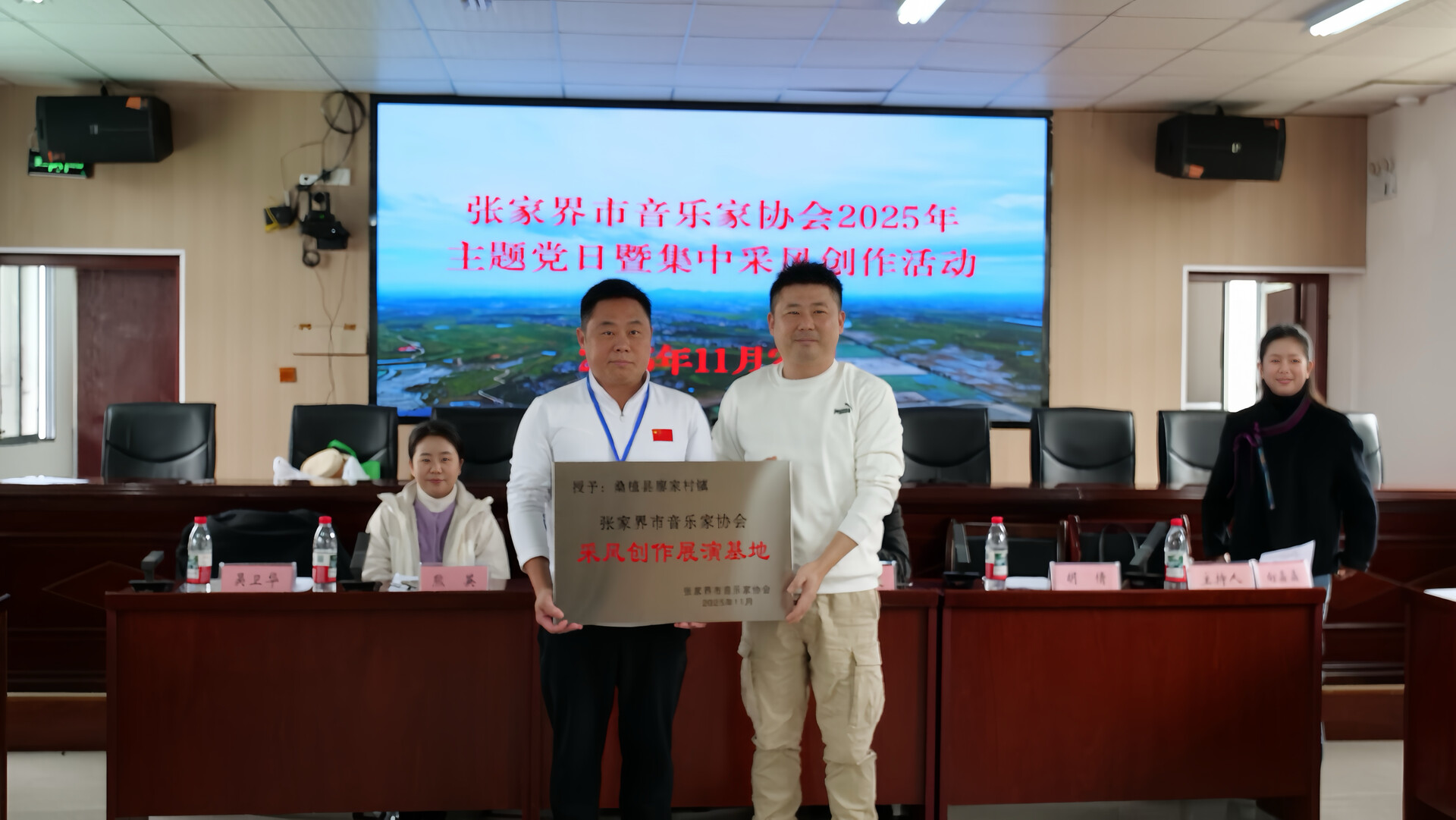 在廖家村镇政府会议室,采风团集中学习了文化传承与乡村振兴相关精神,张家界市音乐家协会现场授予廖家村镇“张家界市音乐家协会采风创作展演基地”称号。