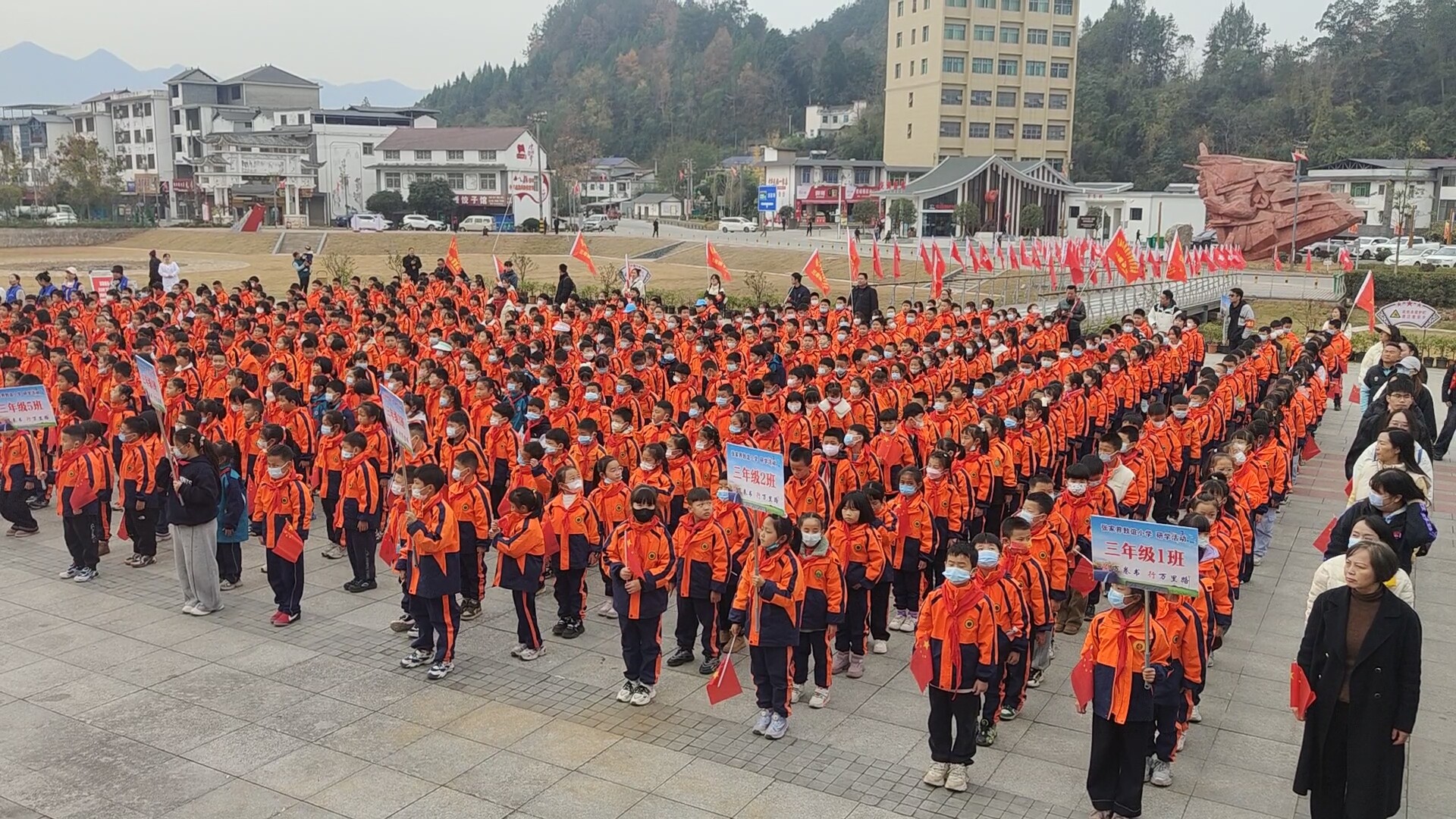 桑植融媒12月9日讯(记者 何蜜)12月9日,桑植县迎来今冬又一波研学热潮。12辆大巴有序停放在中国工农红军第二方面军长征出发地纪念馆的停车场,来自张家界敦谊小学的600余名学生身着统一校服、佩戴鲜艳红领巾,在这片红色热土上开启了一堂生动的红色历史实景课。