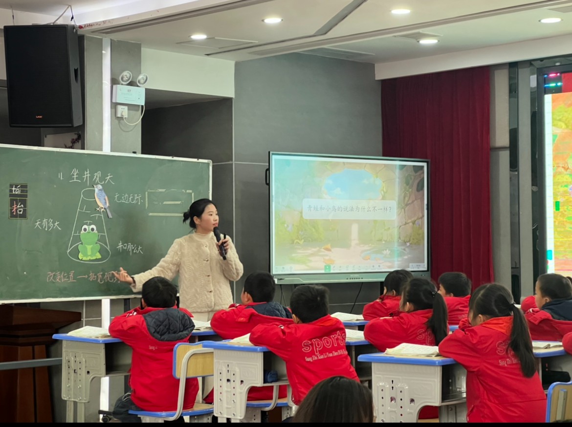 三堂精彩纷呈的示范课拉开活动帷幕。数学课堂上,《认识立体图形》一课,教师以生活物品为教具,引导学生直观感知长方体、正方体、圆柱和球的特征,让抽象的几何知识变得具象可感;《植树问题》一课,授课教师聚焦数学思维的培养,巧妙创设情境,带领学生层层递进地破解植树问题的奥秘。语文示范课《坐井观天》上,授课教师紧扣寓言故事的文体特点,通过分角色朗读、想象补白、指导书写等方式,引导学生领悟故事蕴含的深刻道理。