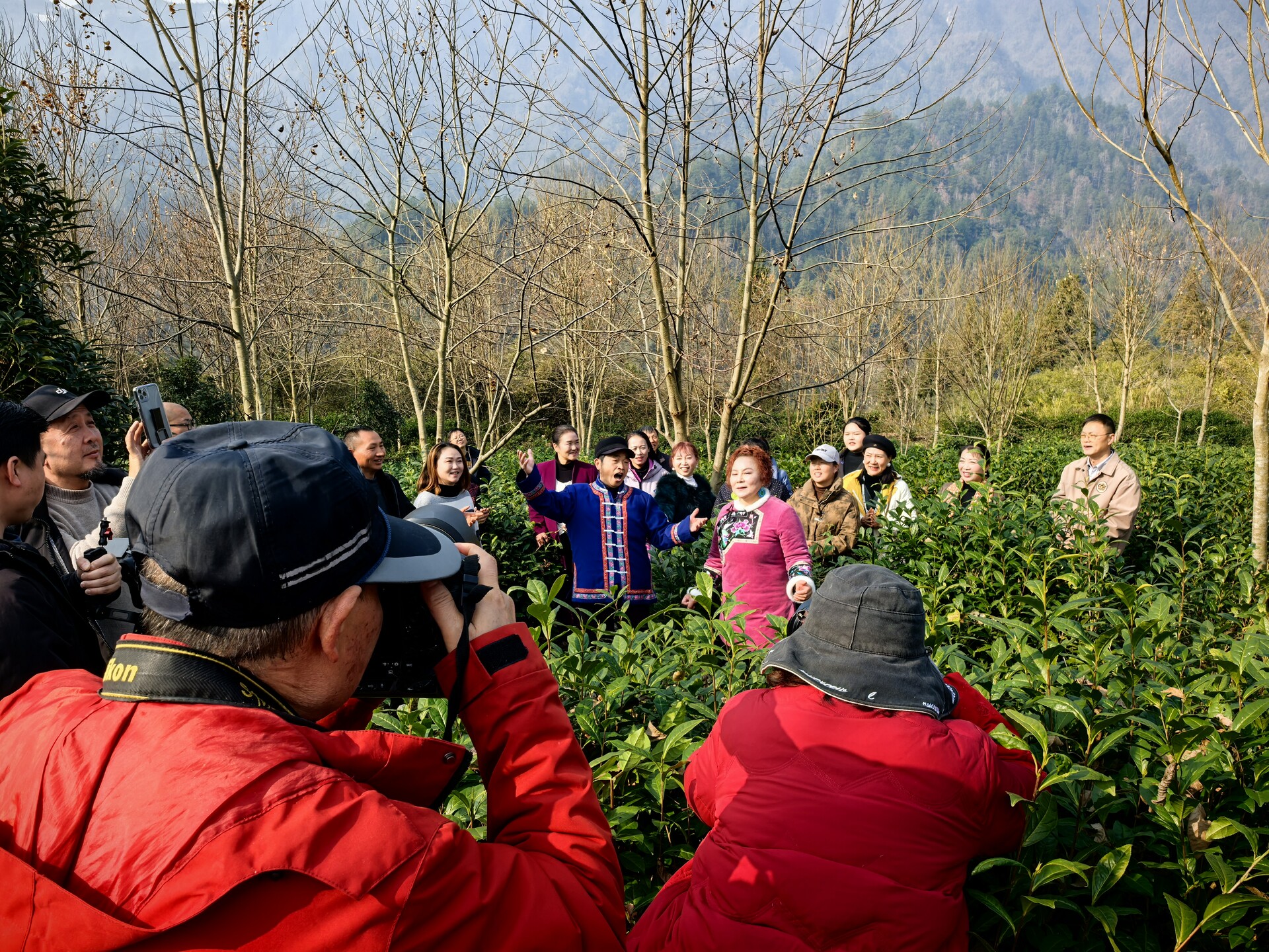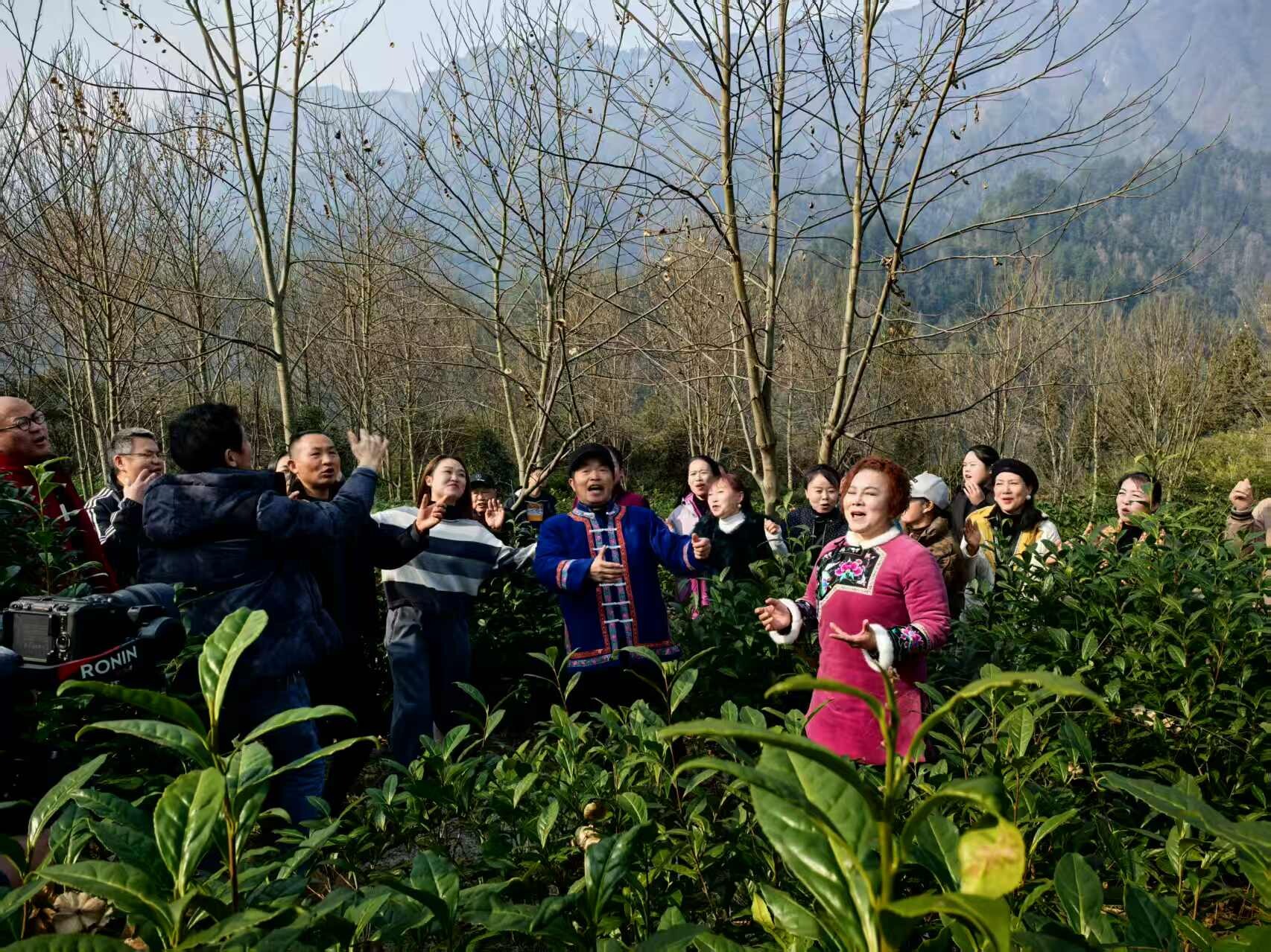 茶园里,茶树在冬日依旧整齐挺立,长势喜人,绿意盎然,展现出蓬勃生机。活动中,摄影家们用镜头捕捉茶山的层叠线条与静谧之美;桑植民歌国家级非遗传承人尚生武等文艺家则在茶园中即兴唱起了悠扬的桑植民歌。歌声吸引了众人,大家自发围聚,共同唱响乡音,现场气氛热烈融洽,艺术与自然生动交融。