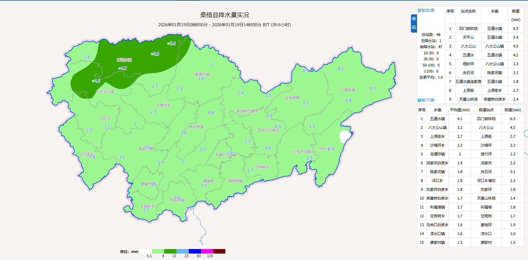 【降雨雪实况】1月19日2时至19日14时,桑植县普降小雨,最大累计降雨量出现在五道水镇四门岩林场为6.5毫米。