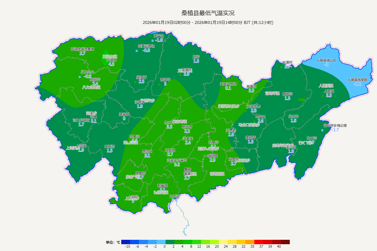 【气温实况】1月19日2时至19日14时,全县大部分气温降至3—4℃,最低气温出现在人潮溪镇白石村为-2℃。
