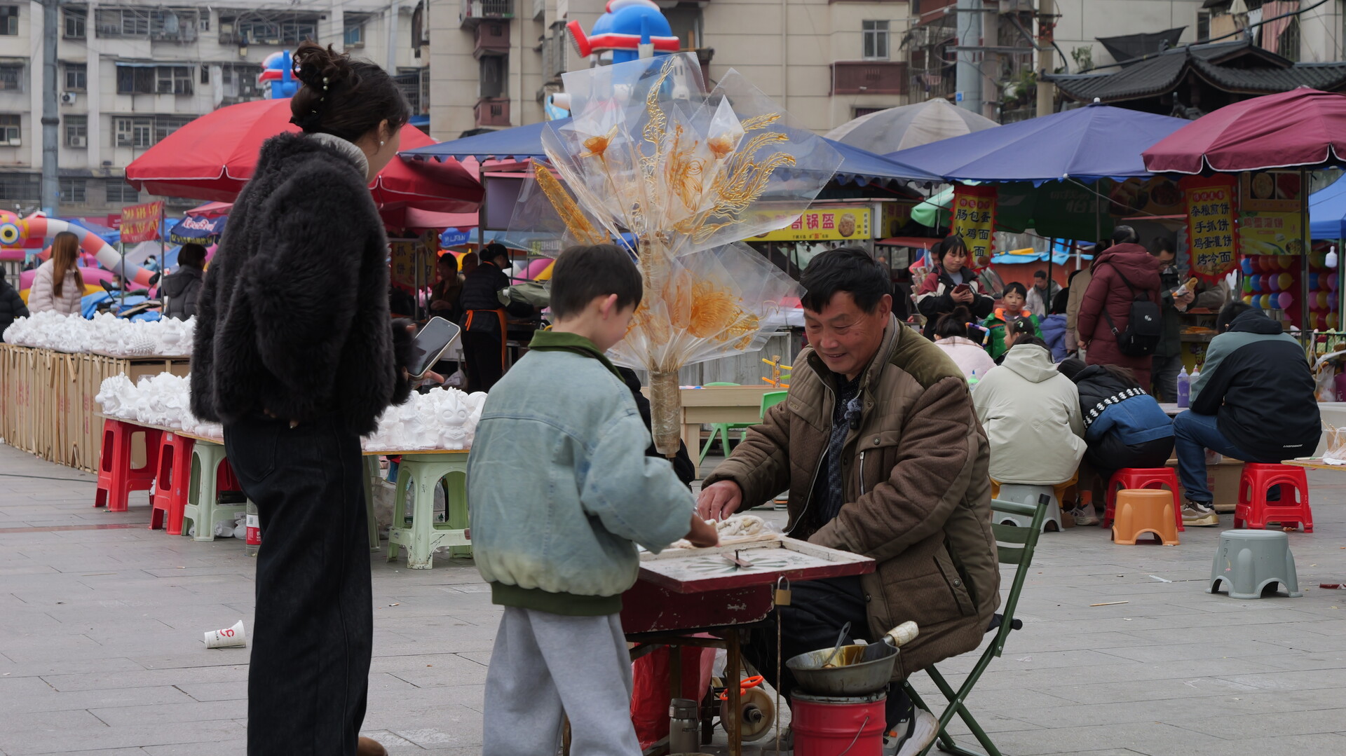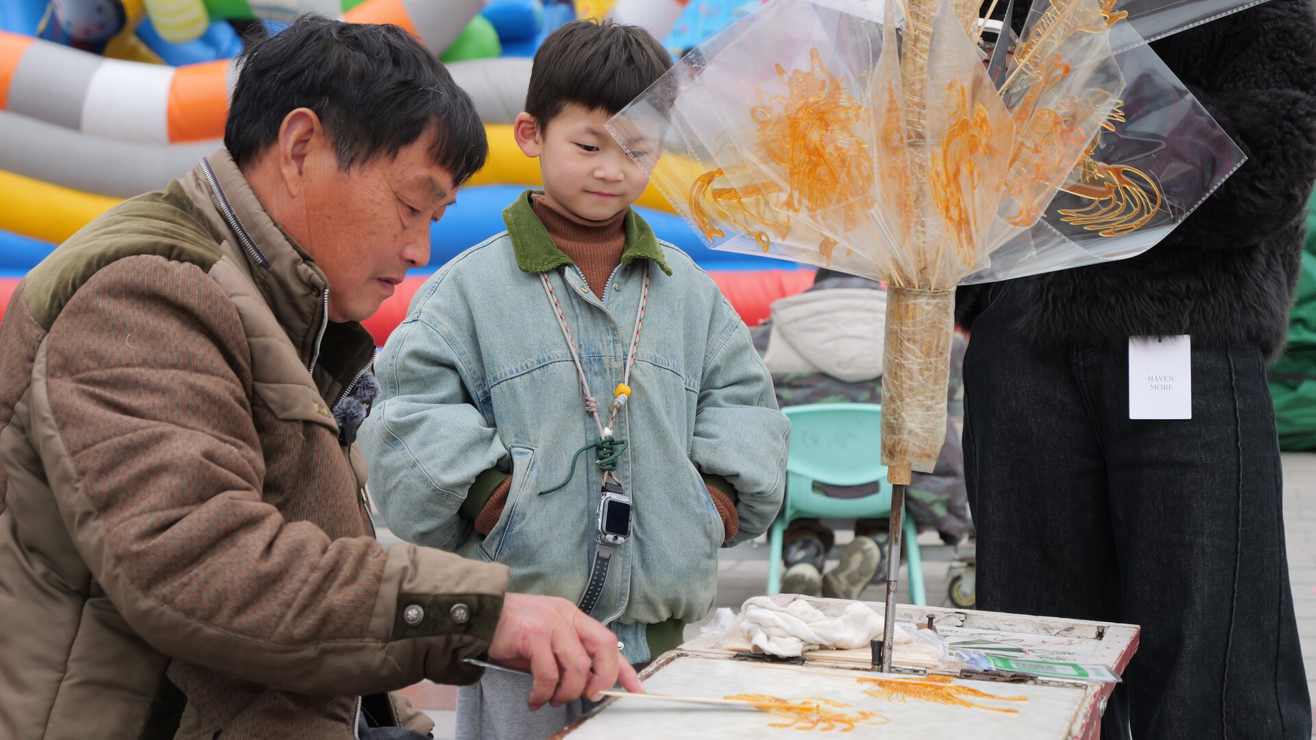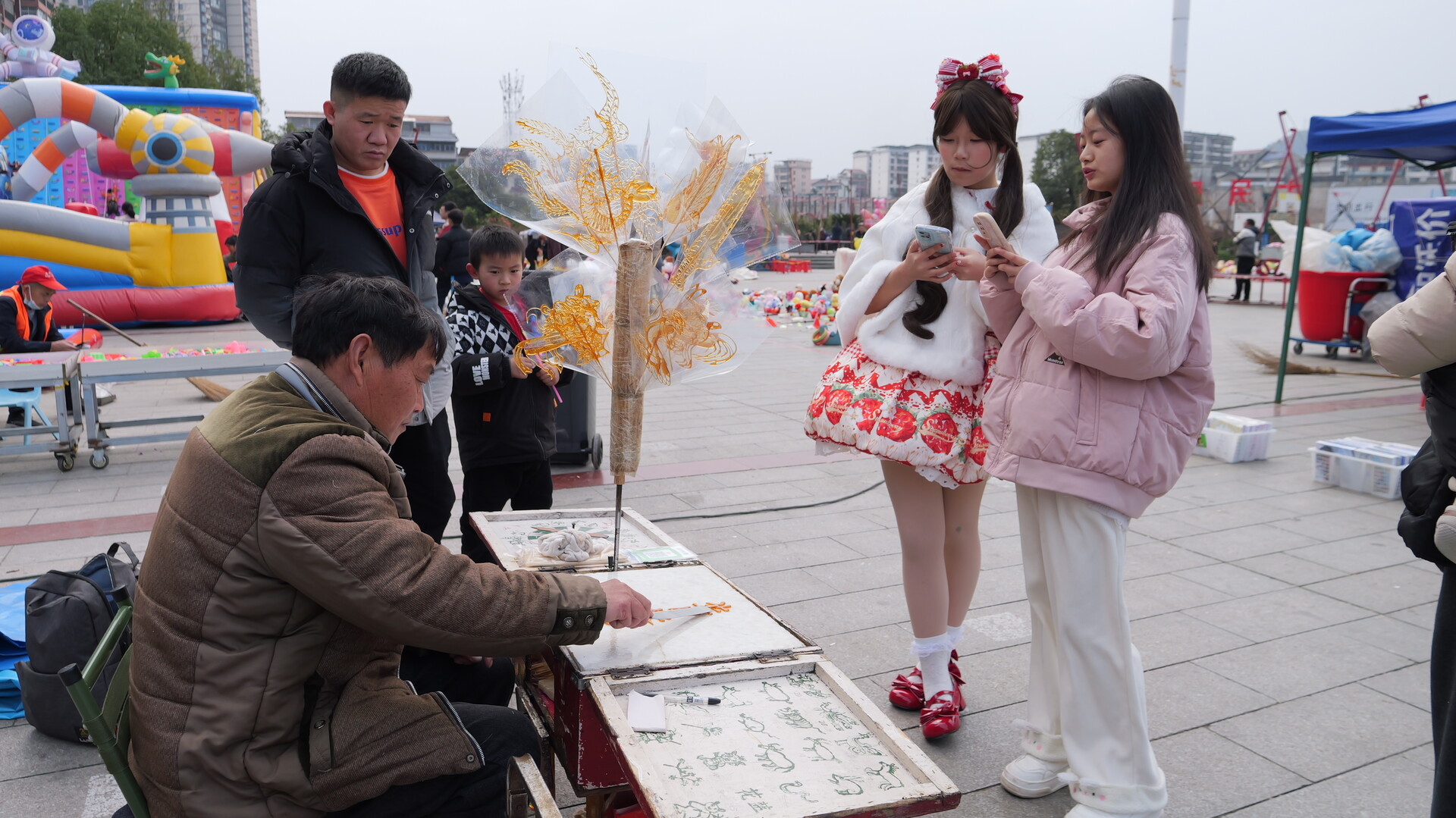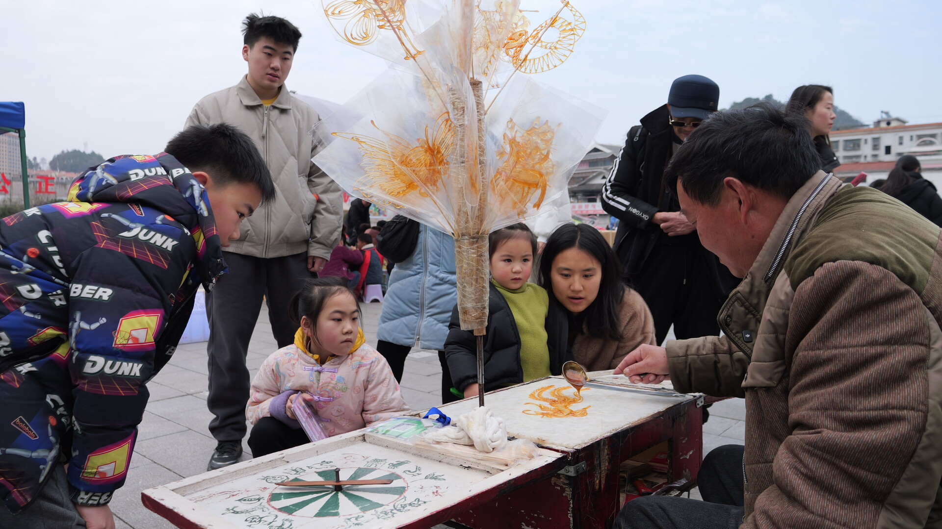 早年摆摊期间,每到学校放学就是陈文星摊位最热闹的时候。“那时候只要一摆好摊子,周围就围满了小孩子,转转盘、等糖画,叽叽喳喳的,特别热闹,一毛钱一个的糖画,一天能挣三四十块。”回忆起当年的盛况,陈文星脸上露出笑容。而最让他暖心的,是看着老顾客一代代成长:“经常有年轻姑娘带着孩子来买,说‘我小时候就吃你做的糖’,现在又带自己的孩子来买糖画了。”