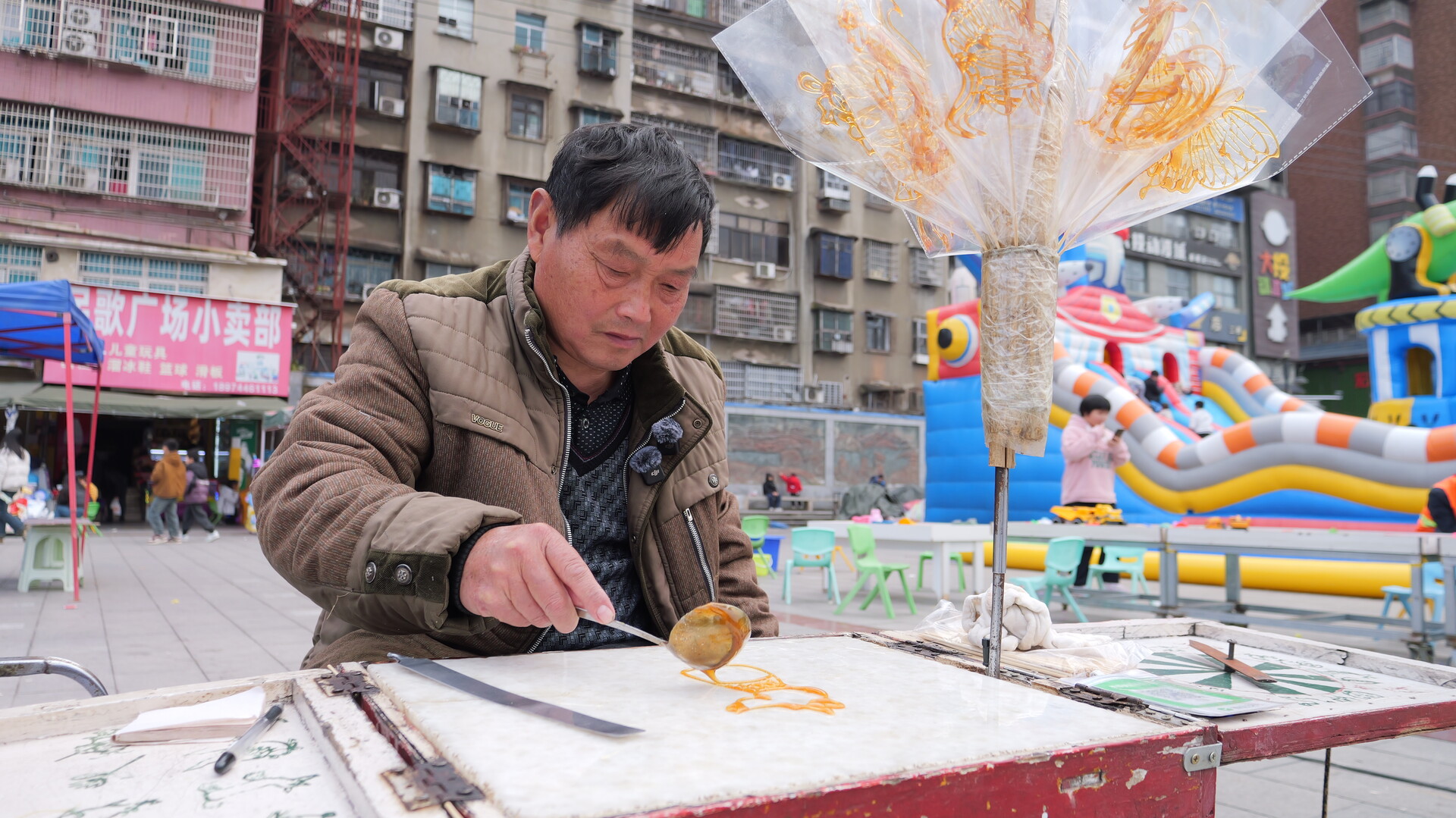 1989年,23岁的陈文星在外地务工时偶然与糖画技艺结缘,被这门“以糖为墨、以勺为笔”的手艺吸引,随即拜师学艺,回到桑植后,他依旧潜心钻研、反复打磨技艺,每年9月下旬农忙结束、天气转凉,就收拾好工具箱进城摆摊。