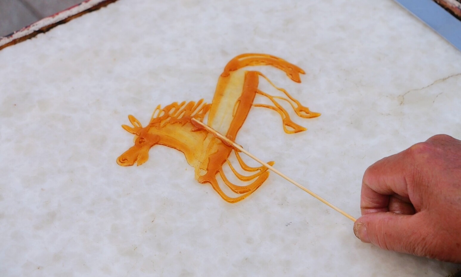 “糖画技艺,关键在于落笔之前就得胸有成竹。”陈文星说,“心中要先有图样,蝴蝶怎么飞,桃子怎么圆,鸟的翅膀怎么翘,只有基本功练扎实了,画出来的东西才有灵气。”如今,他还能熟练画出各种新潮图案,2022年冬奥会期间,客人点名要“冰墩墩”,他只凭着大家的口头描述便画了出来,“他们讲是熊猫的样子,我跟着琢磨着改几笔,最后还真像了!”