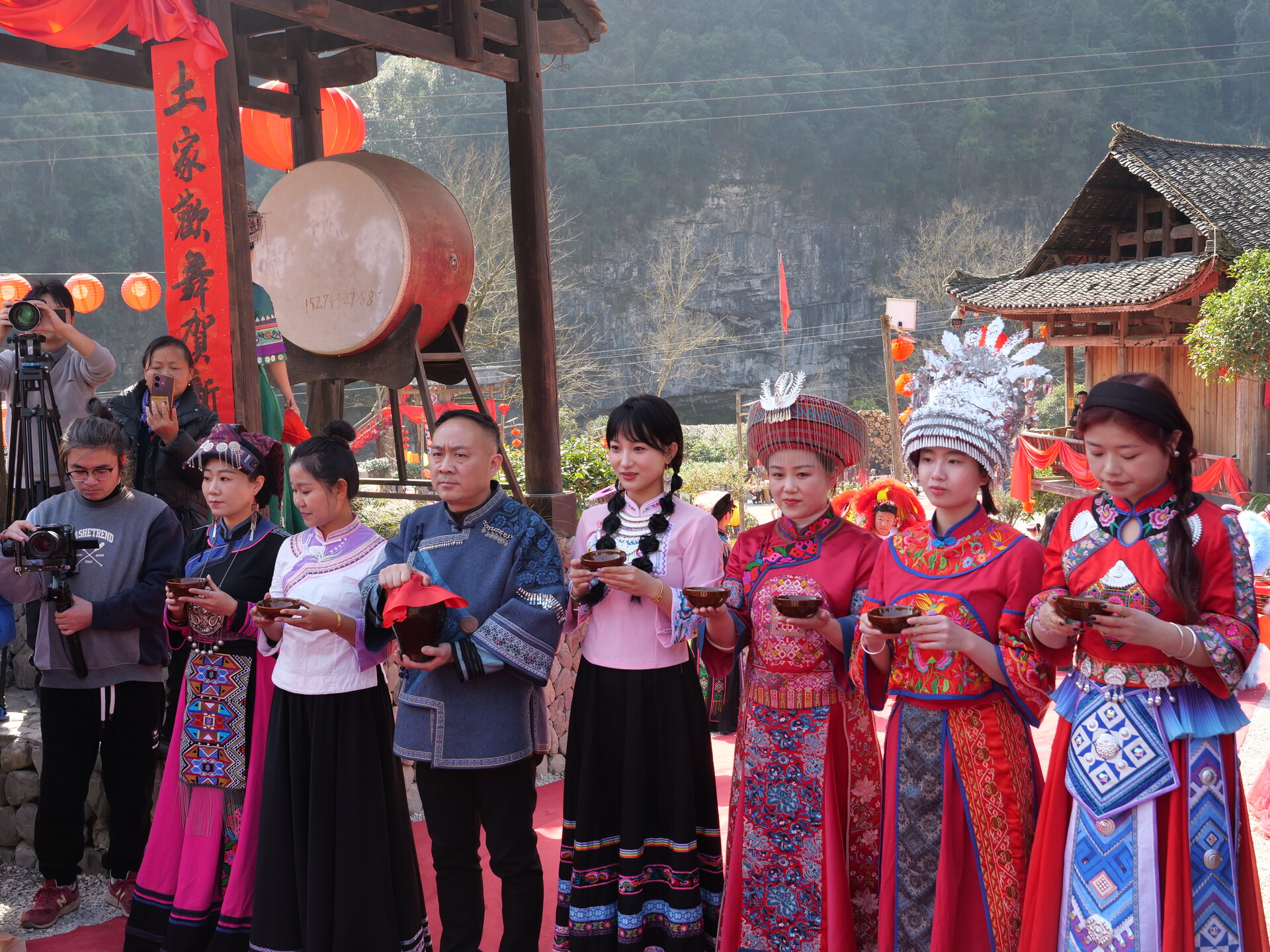 12桌以土家吉祥语命名的宴席整齐排开,每桌8名宾客围坐,共品土家团年饭的滋味。土家赶年——这一传承近500年的习俗,源于昔日土家将士出征抗倭提前过年的家国情怀,如今已成为土家族凝聚家族情感、祈愿美好生活的重要载体。