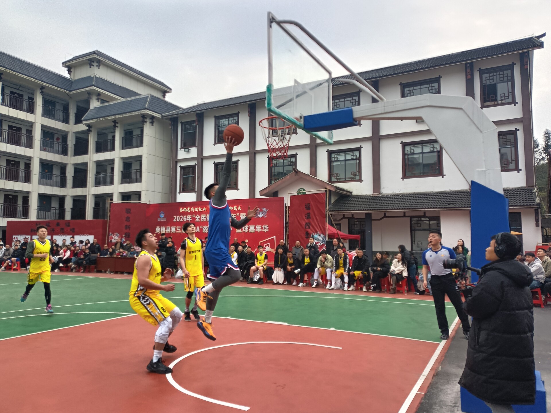 桑植融媒2月19日讯(记者 钟彬豪)2月19日,2026年“全民健身大拜年”暨桑植县第三届年BA“森宝农业杯”篮球嘉年华在廖家村镇火热开赛。各乡镇篮球队代表齐聚赛场,以热血篮球对决为新春添活力、聚人气,让体育健身成为乡村新年的新风尚。