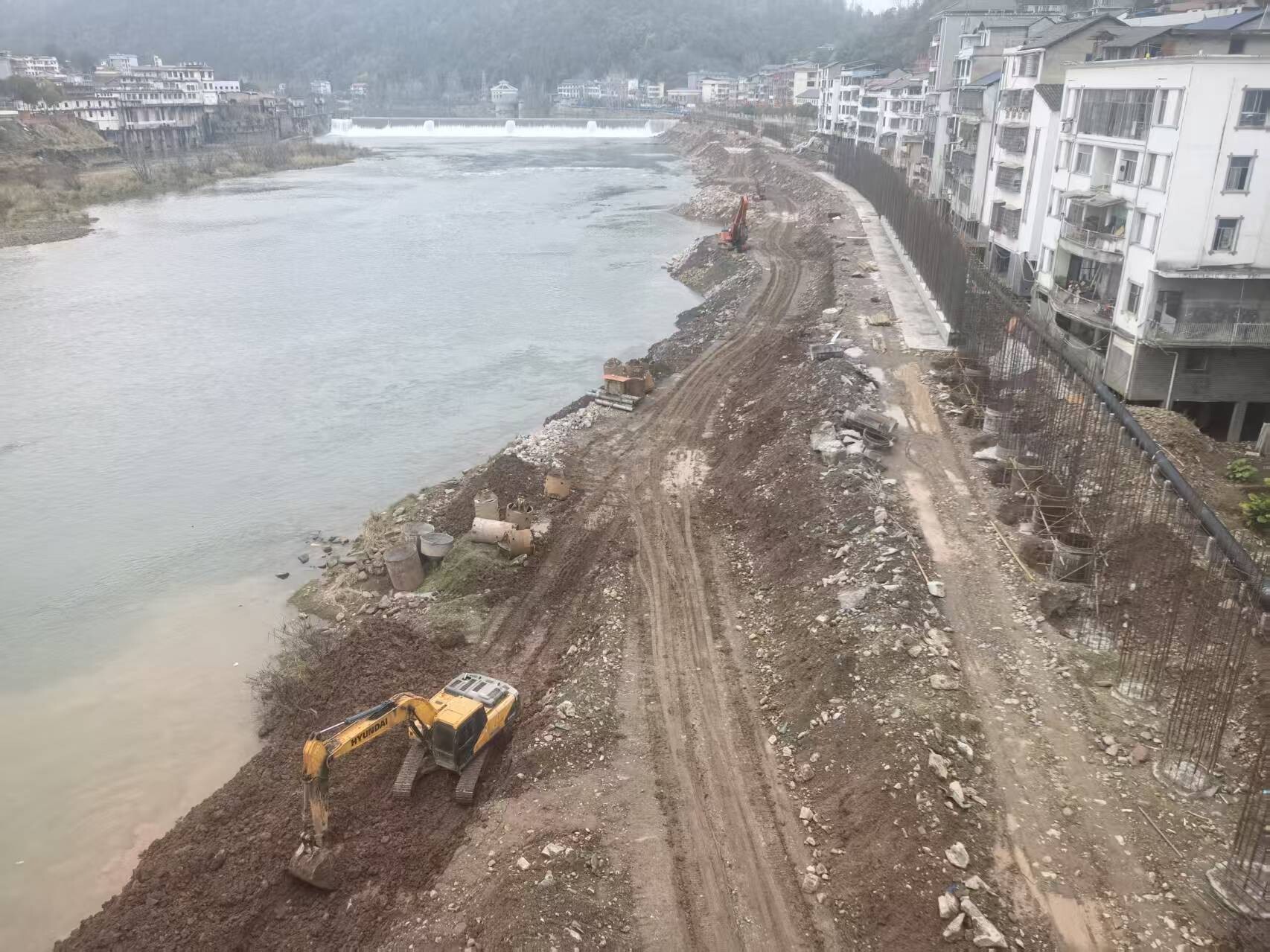 该项目由湖南望新建设集团承建,是澧水流域的重要应急抢险工程。自2025年9月份开工以来,施工团队克服汛期水位波动等挑战,严格按照计划推进。目前,土方开挖、临时便道搭建等基础工程已基本完成,亲水平台浇筑、旧防洪堤拆除等建设内容有序推进。左岸664.88米防洪体系改建进入冲刺阶段,其中改建桩板式防洪墙278.16米、拆除重建343.02米、新建防浪墙43.7米,整体工程量已完成70%。