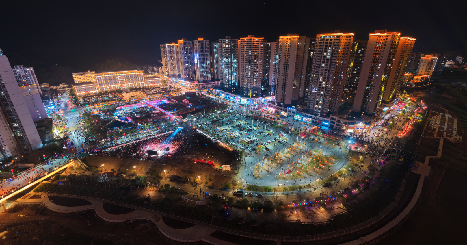 主会场舞台灯光璀璨,《龙马精神》欢快旋律拉开文艺演出序幕,随后《我家住在澧水边》《我的桑植》《给我买把包边扇子来》等节目精彩上演,台下人墙层层叠叠,无数手机举起记录下这份热闹瞬间。
