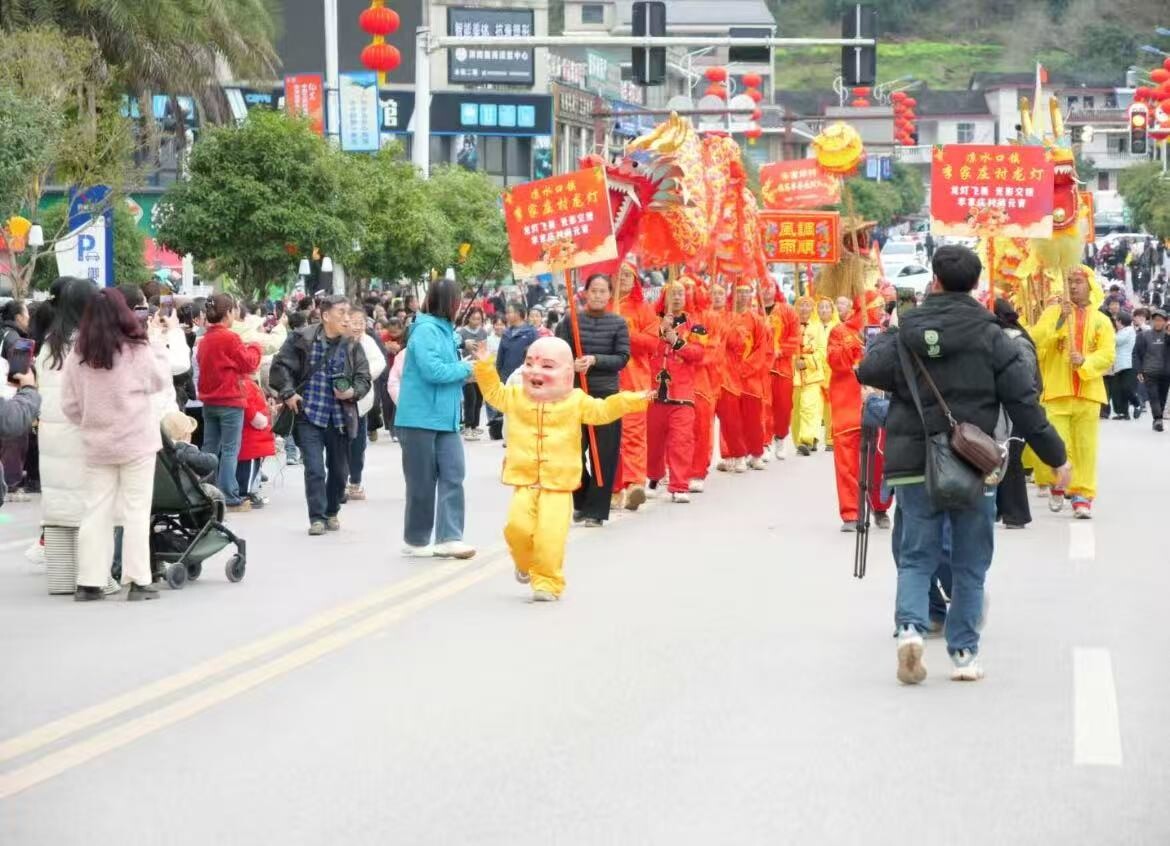“正月十五就是要这么‘闹’,有劲!”下午5:30,300余人组成的民俗巡游方阵盛装出发,稻草龙、白族仗鼓舞、舞龙舞狮、打花灯、蚌壳灯、民族服饰展等桑植本土特色民俗沿街展演,锣鼓喧天、气势十足。