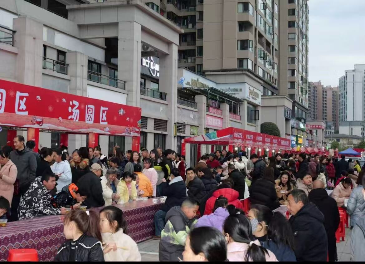 滨河路美食街前,市民游客有序排队,免费品尝多种口味本土元宵,以惠民消费暖民心、聚人气、添活力,现场暖意融融、欢乐祥和。