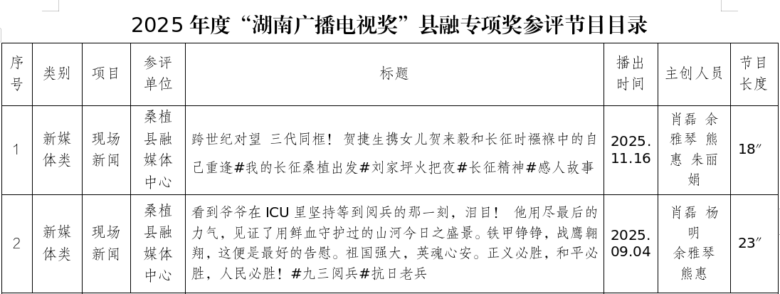 根据湖南省广播电视局、湖南省广播电视协会《2025年度“湖南广播电视奖”县融专项奖评选方案》要求,经桑植县融媒体中心初审初评,以下2件新媒体作品拟推荐参评2025年度“湖南广播电视奖”县融专项奖评选,现将送评作品予以公示。公示期间为2026年3月9日至13日。