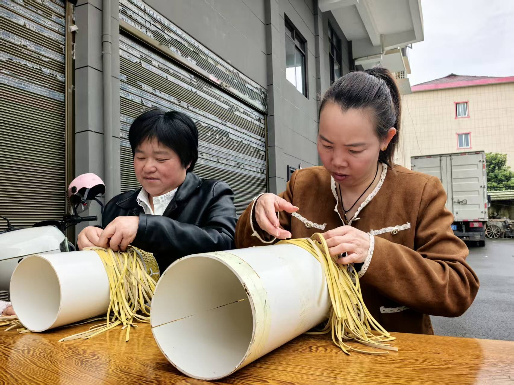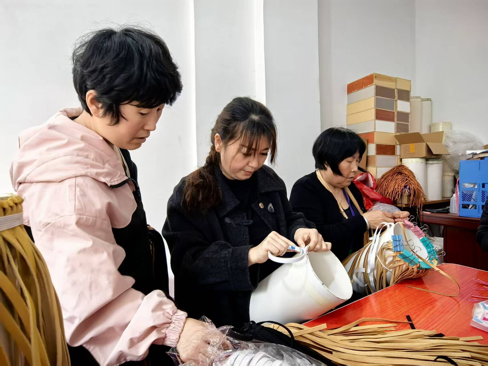 刚培训两天的何女士,已经能独立完成半成品。她利用接送孩子的间隙,将在家编好的半成品送来交付。“这个工作特别自由,我要接送小孩,所以学会了就拿回家做。快的一天能做十几个,我才学一天也能做两个。”何女士一边交货一边笑着说。
