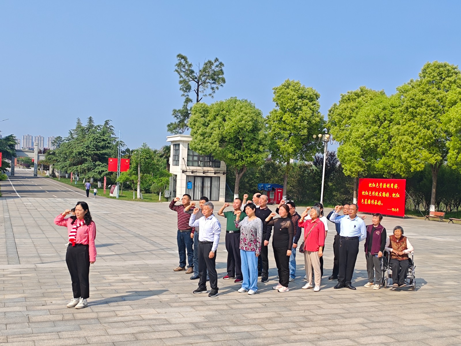 4月18日,党员们来到湘鄂西苏区革命纪念园。这座全国爱国主义教育示范基地苍松翠柏环绕,党员们在贺龙元帅铜像广场肃立致敬,瞻仰铜像、缅怀元帅生平;随后前往烈士纪念碑前,深切缅怀革命先烈,寄托哀思。紧接着,全体人员面向鲜红党旗重温入党誓词,铿锵誓言传递出退休党员对党忠诚的坚定信念,彰显了不忘初心、砥砺前行的担当。