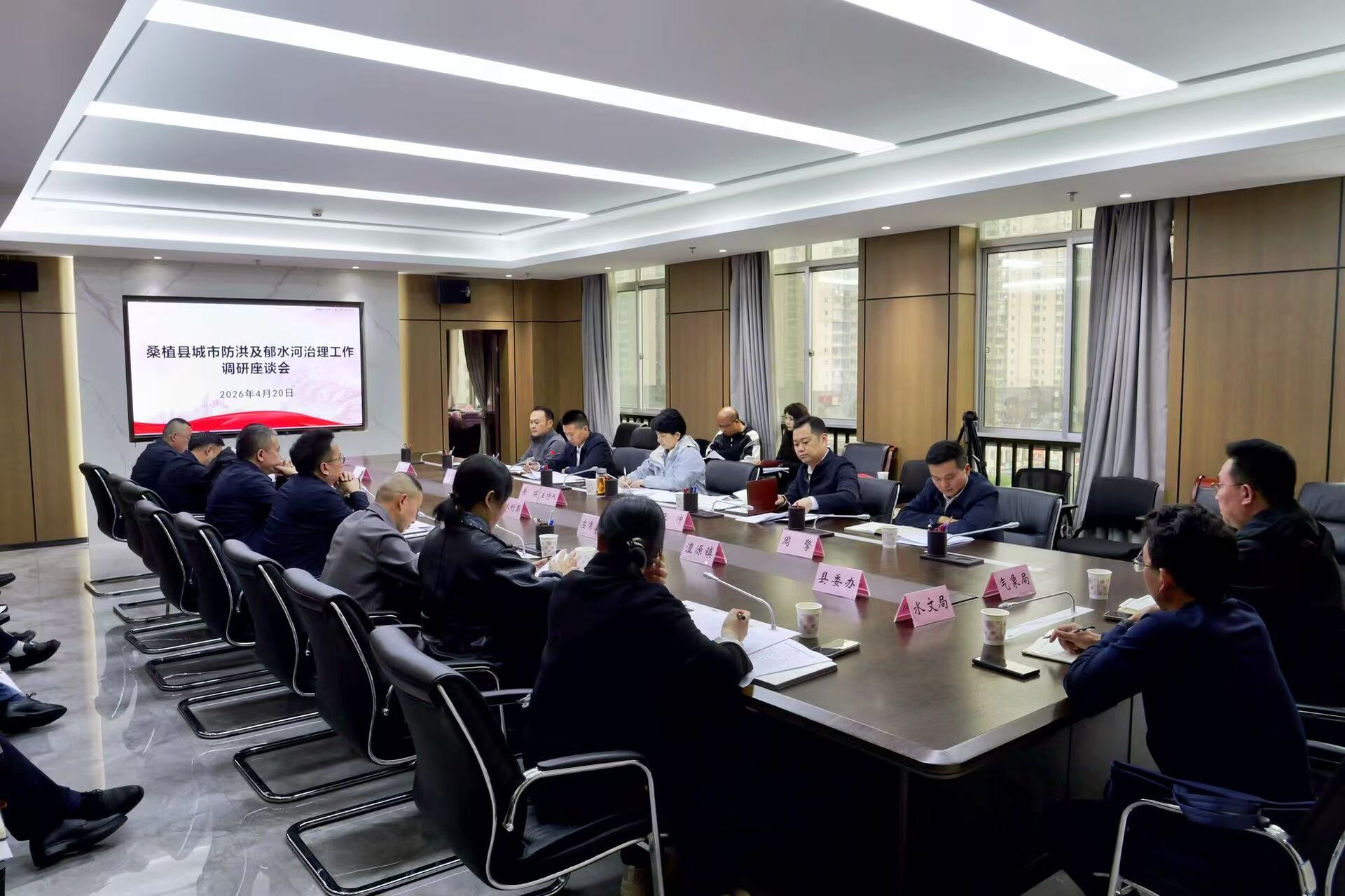 在调研座谈会上,县水利局、县应急局、县城管局、县住建局等相关单位汇报了城市防洪及郁水河治理相关工作开展情况。