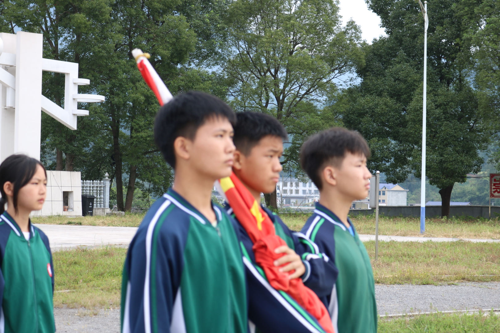 迎着初升的朝阳,国旗护卫队的同学们踏着铿锵有力的步伐,护卫国旗入场,庄严的国歌奏响,拉开了开学典礼的序幕。