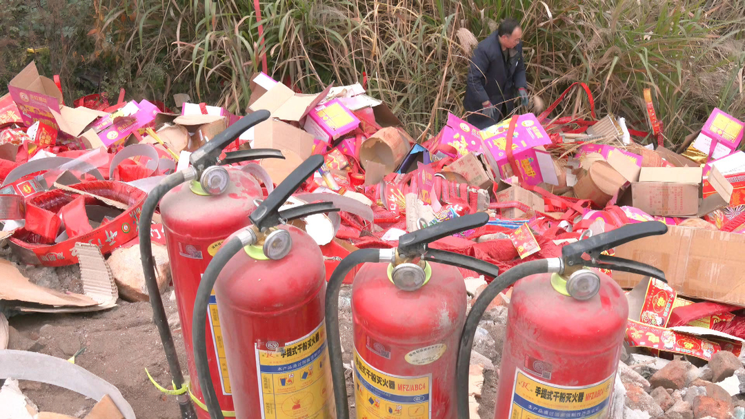 销毁现场,工作人员严格执行安全措施,将非法烟花爆竹进行拆装、抛投及浇上柴油,以彻底销毁这些危险物品。为了防止销毁出现火灾等意外情况,执法人员周密地考虑了安全因素,在现场配备了灭火器,以便随时进行火灾扑灭。执法人员还仔细查看了这批非法烟花爆竹的质量,感受其重量发现比正常的烟花爆竹要轻,甚至出现填充泡沫的情况。