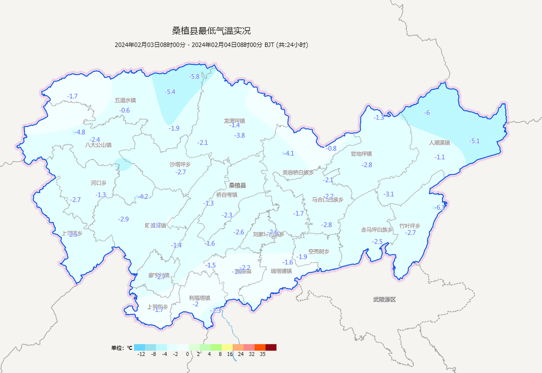 2 月 3 日 08 时-4 日 08 时桑植县最低气温分布图二、具体天气预报