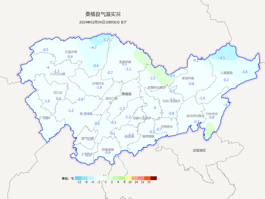 2 月 4 日 10 时桑植县气温实况分布图